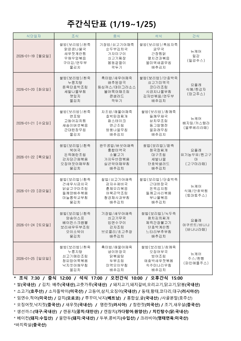 | 주간식단표(26.1.19~01.25) |